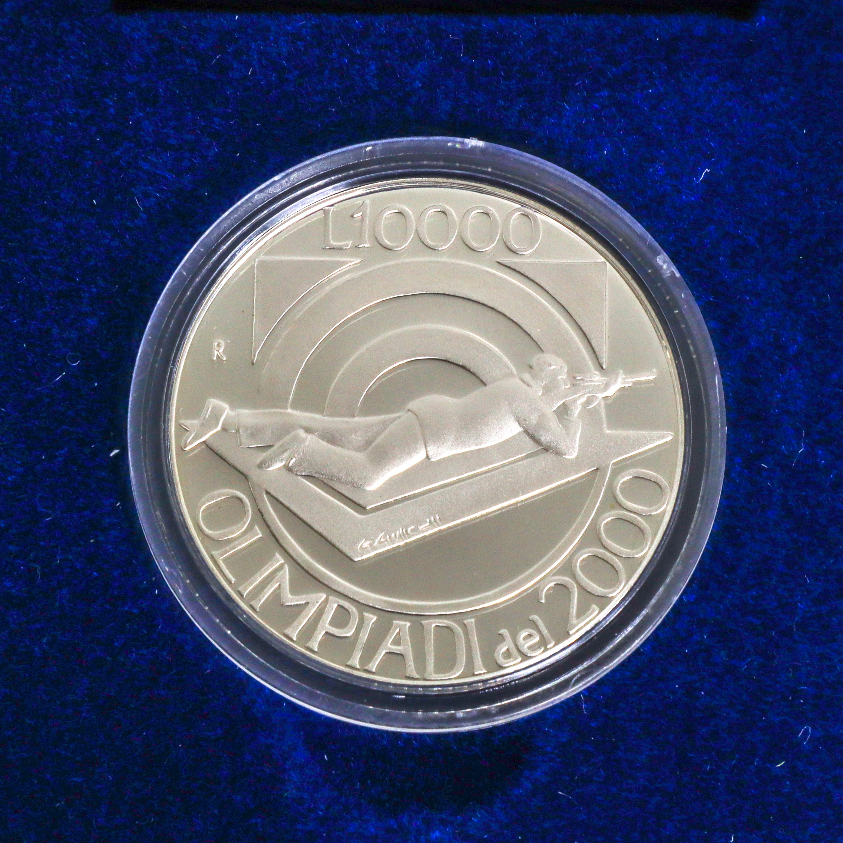 Obverse of the coin: In the center, the Olympic discipline of rifle, in the background symbols identifying a target, at the top L.10000 and the legend "OLIMPIADI 2000" GIULIANELLI (author of the sketch)