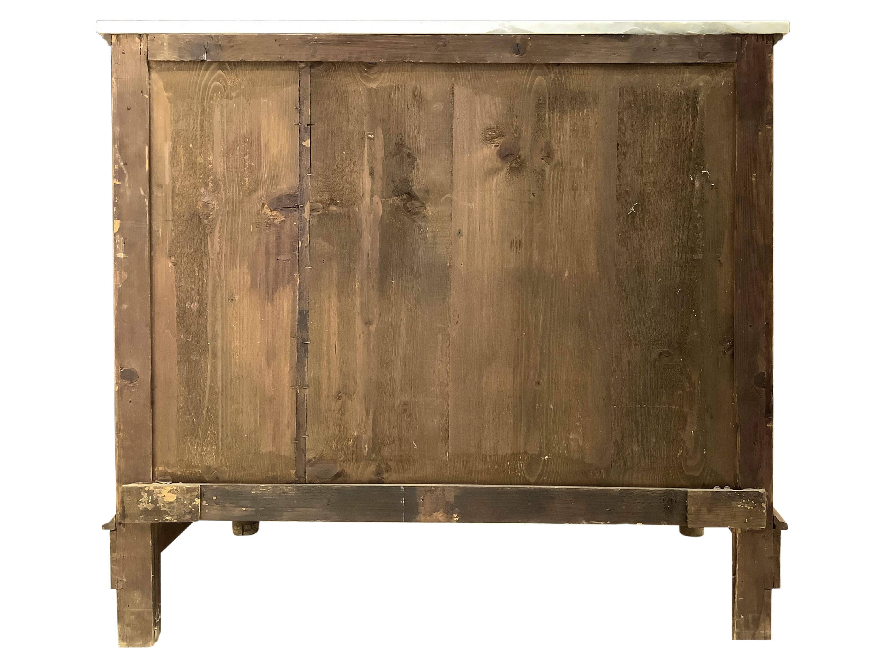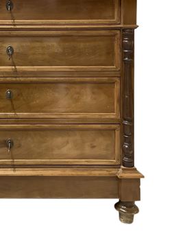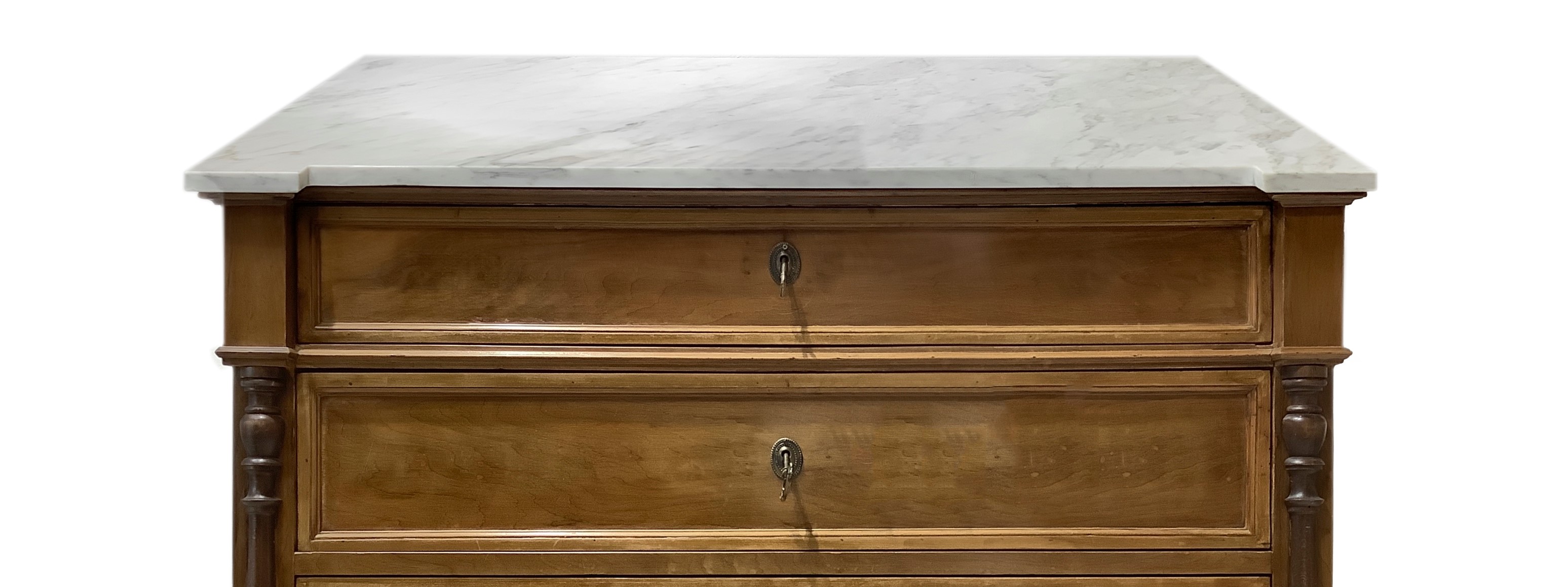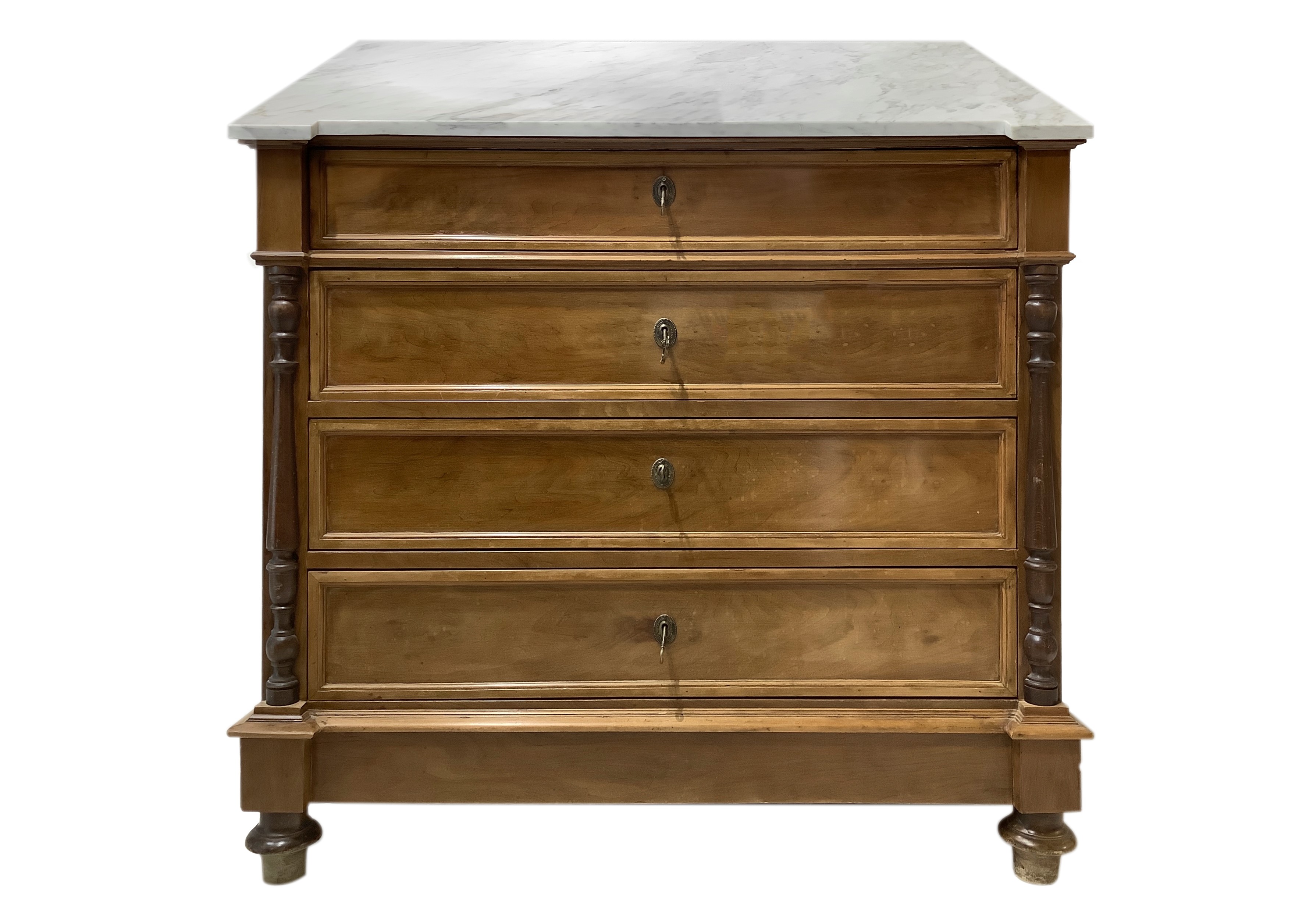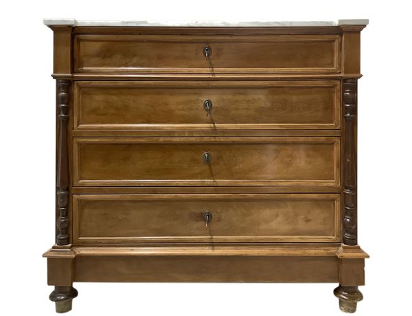 Cassettone a quattro cassetti in legno di noce con mezze colonne ai lati, piedi a cipolla e marmo bianco al piano, XX secolo