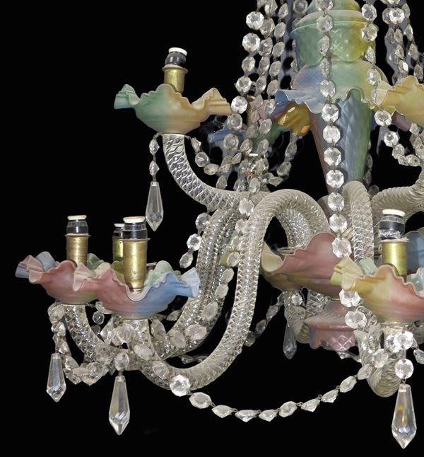 Twisted arms in transparent crystal, saucers in colored glass and rosette toasts, with 12 lights.