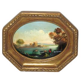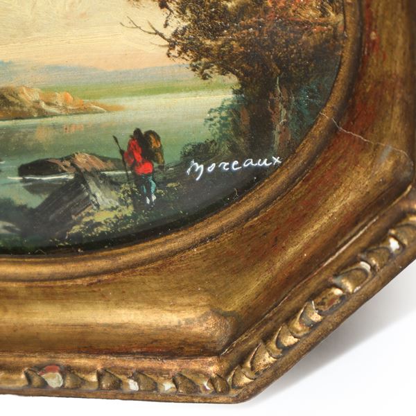 Paesaggio lacustre con castello, coppia di dipinti in cornici ottagonali