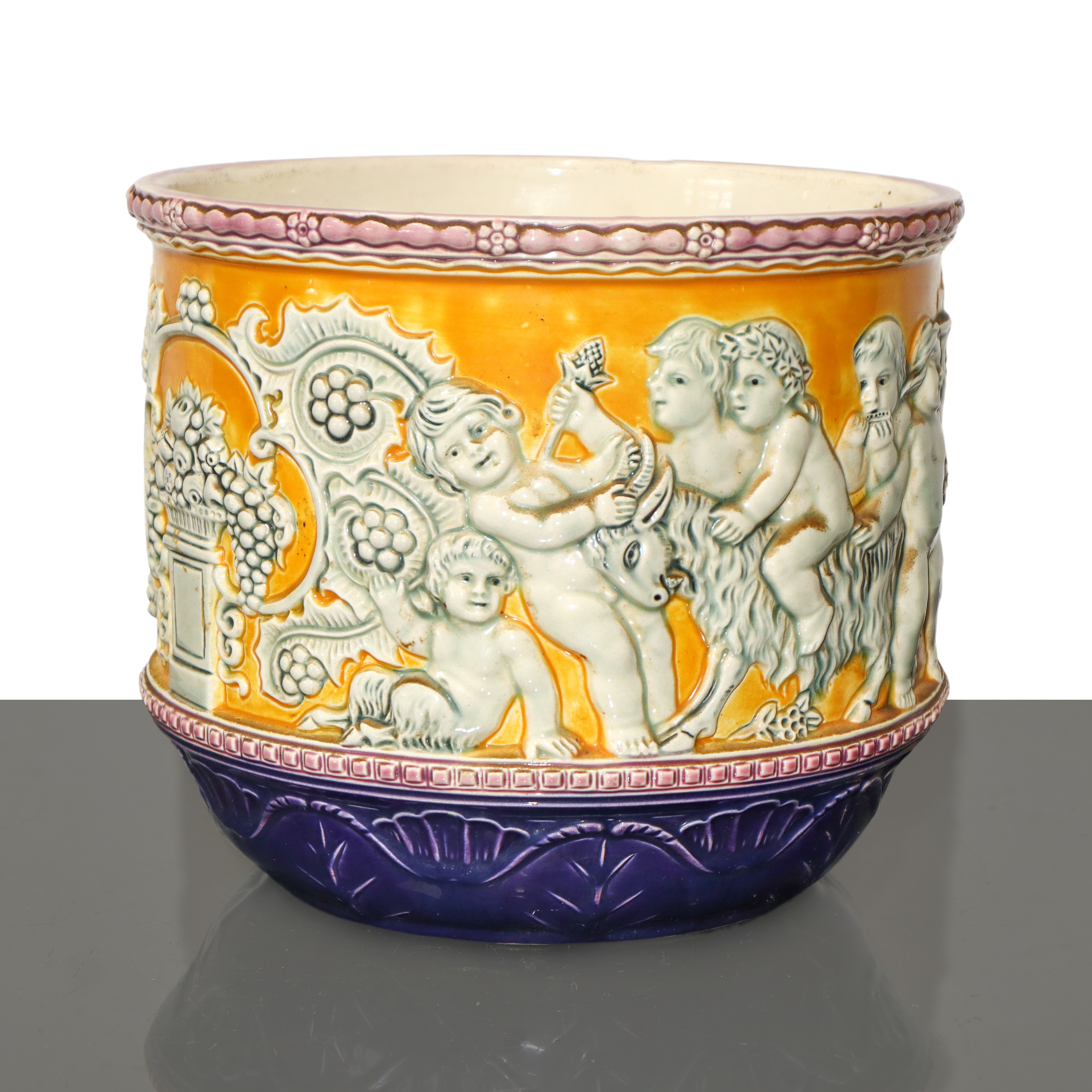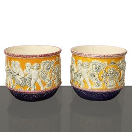 Coppia di vasi Art Noveau in porcellana gialla con putti e trionfi di frutta a rilievo