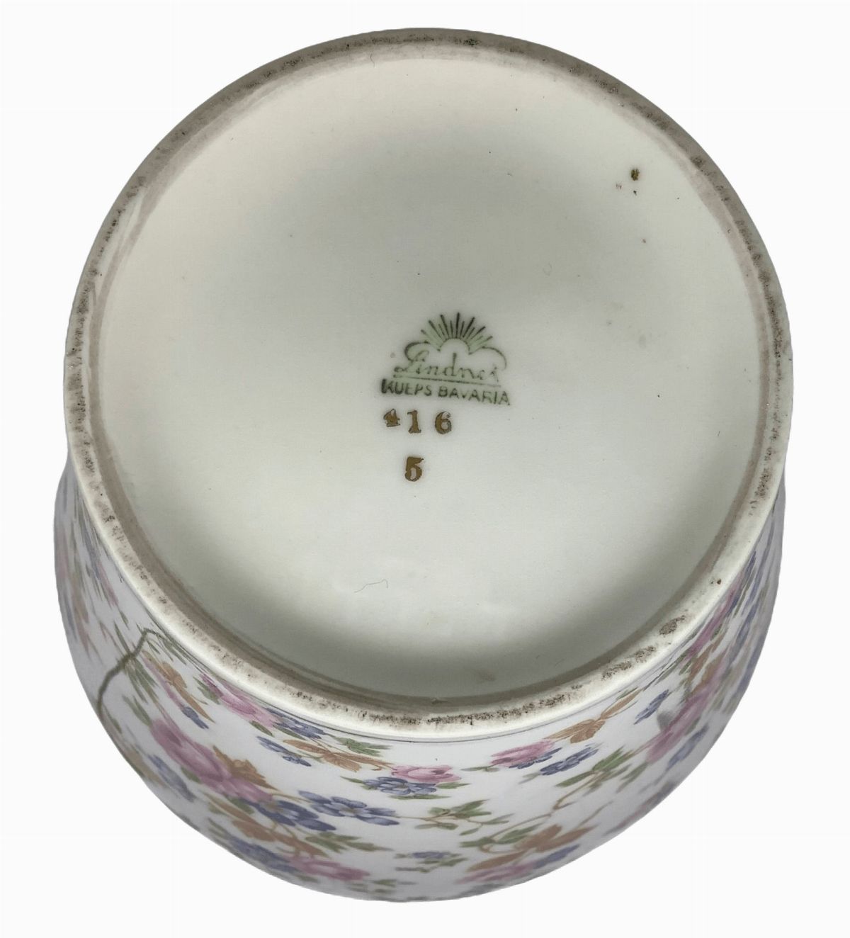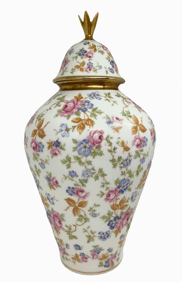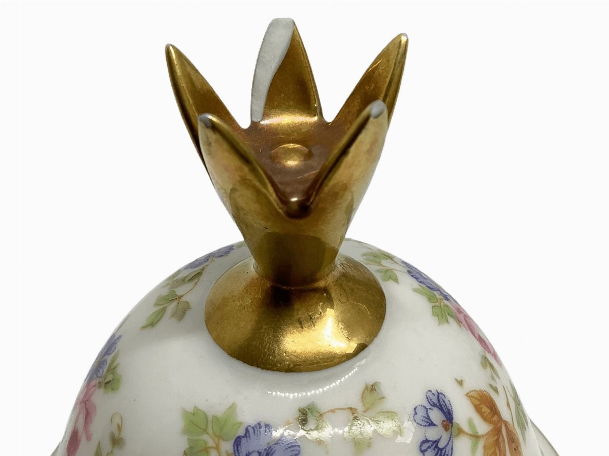 con decorazioni floreali. Marchio alla base. Piccola mancanza all'impugnatura del coperchio.
