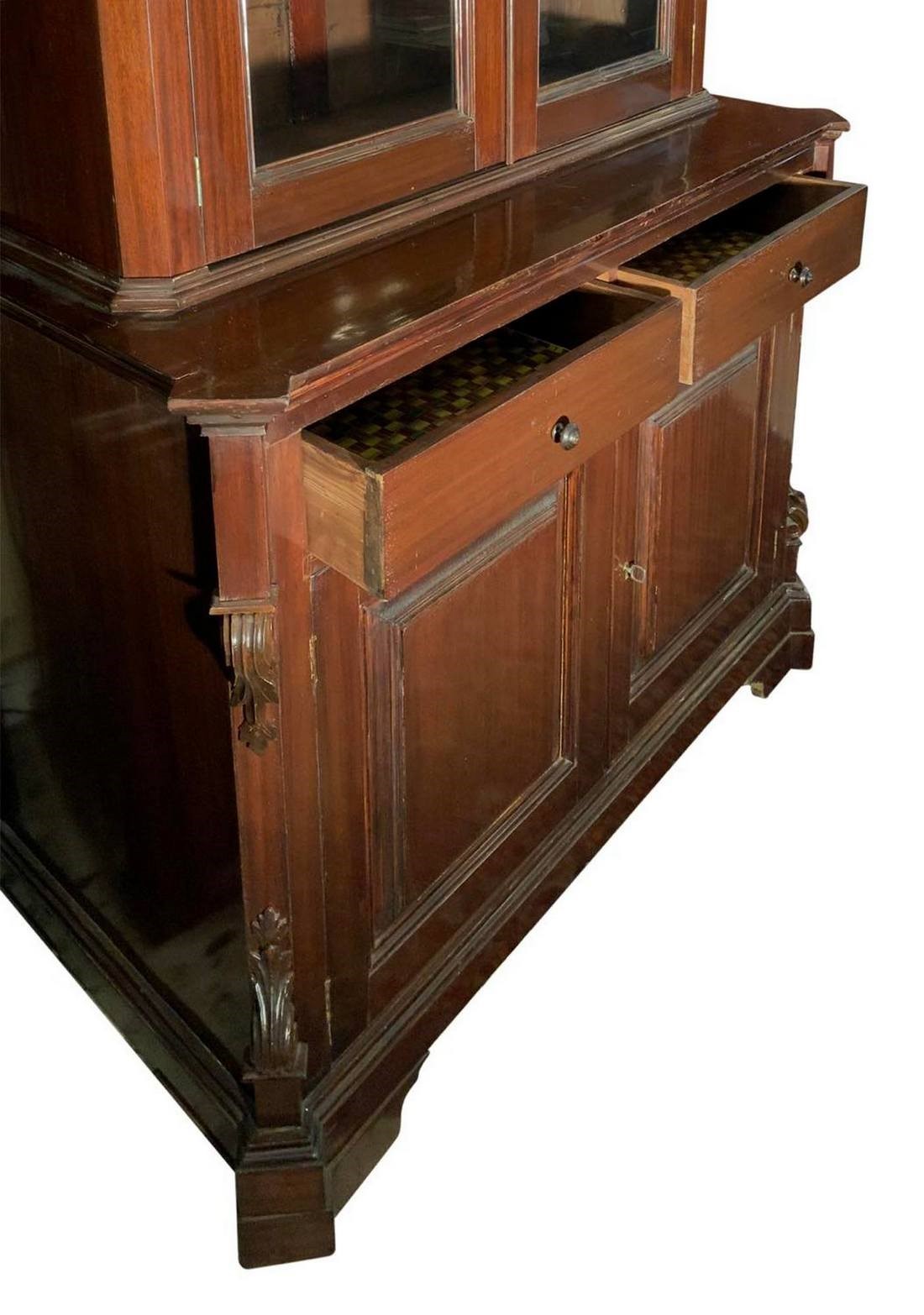 Sideboard in mahogany wood. Sicily, XIX century. Double body. Upper part with glass doors. Lower part two drawers, two doors. ..., Sicilia, XIX secolo