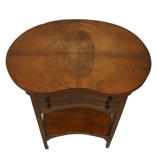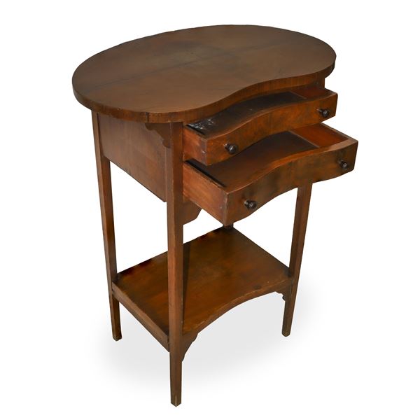 Tavolino a fagiolo in legno di noce con due cassetti sottopiano e quattro gambe, Inizi XX secolo