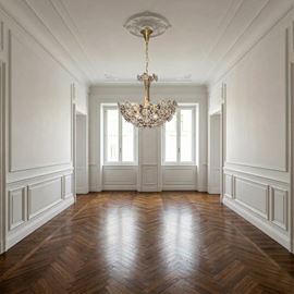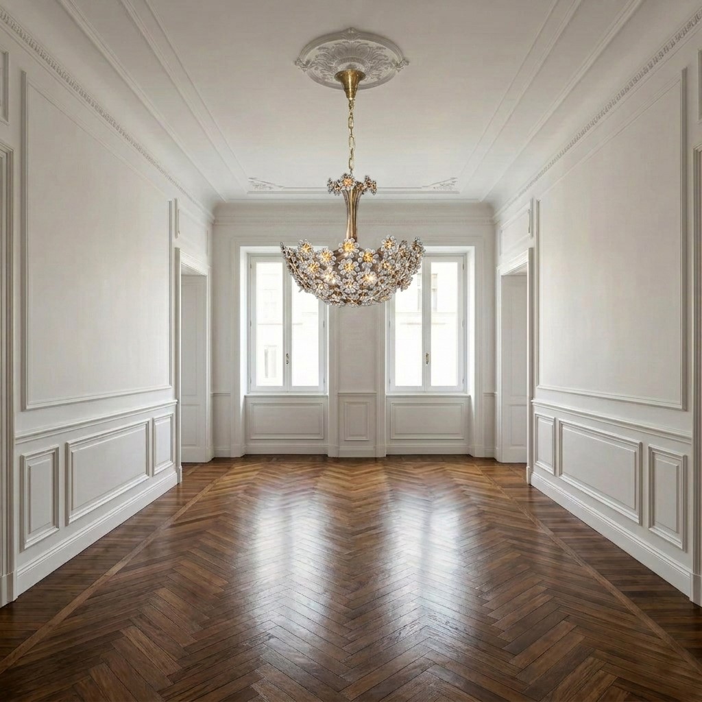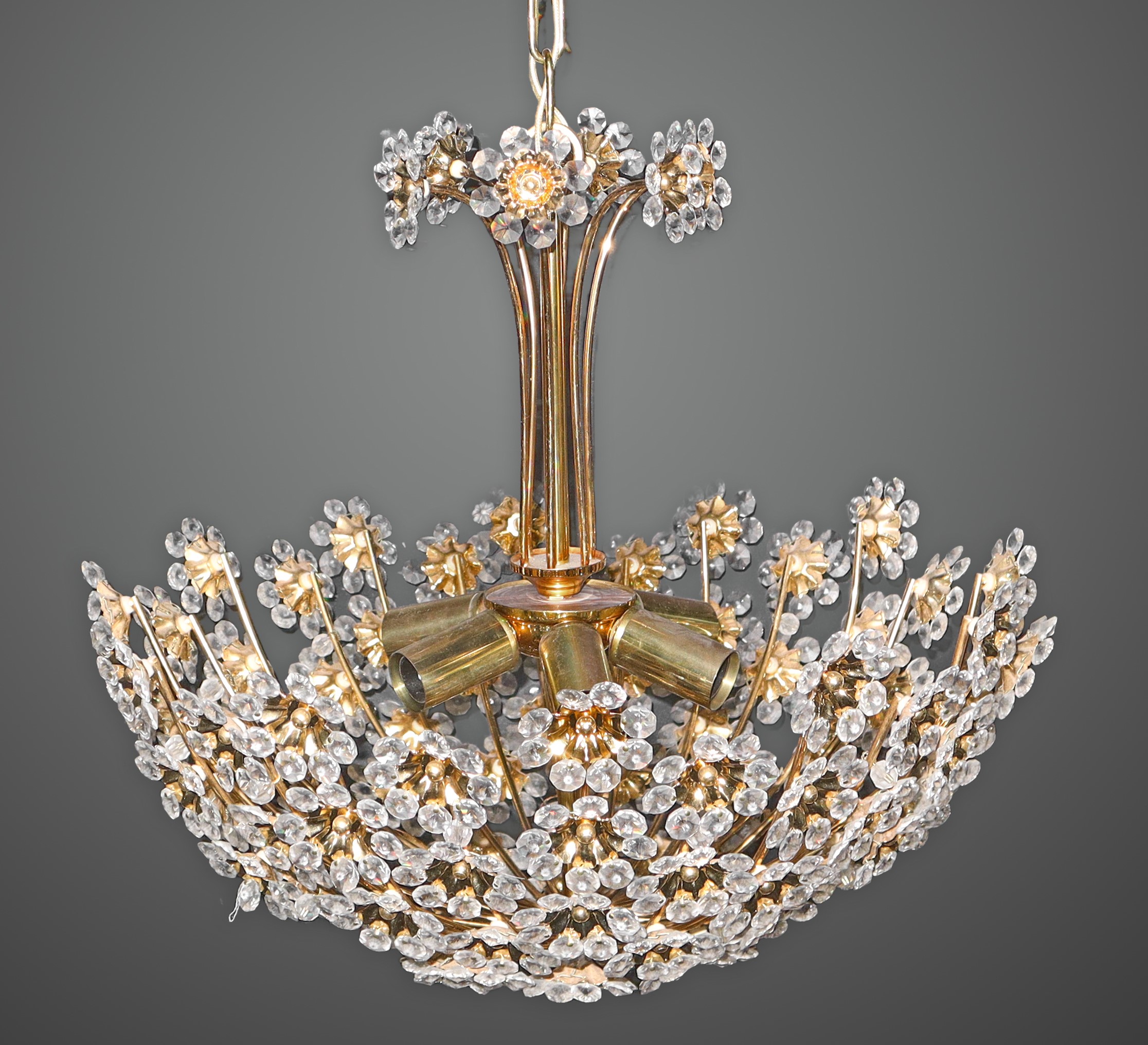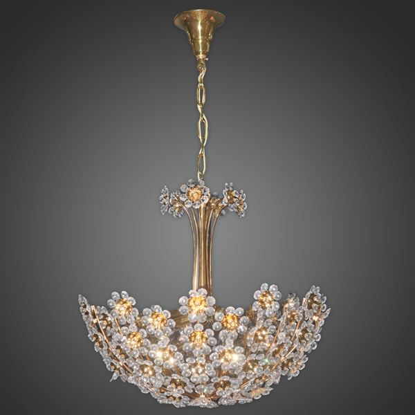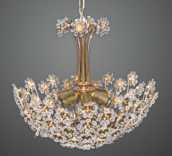 6-light chandelier in gold metal and floral glass decorations, 1960s