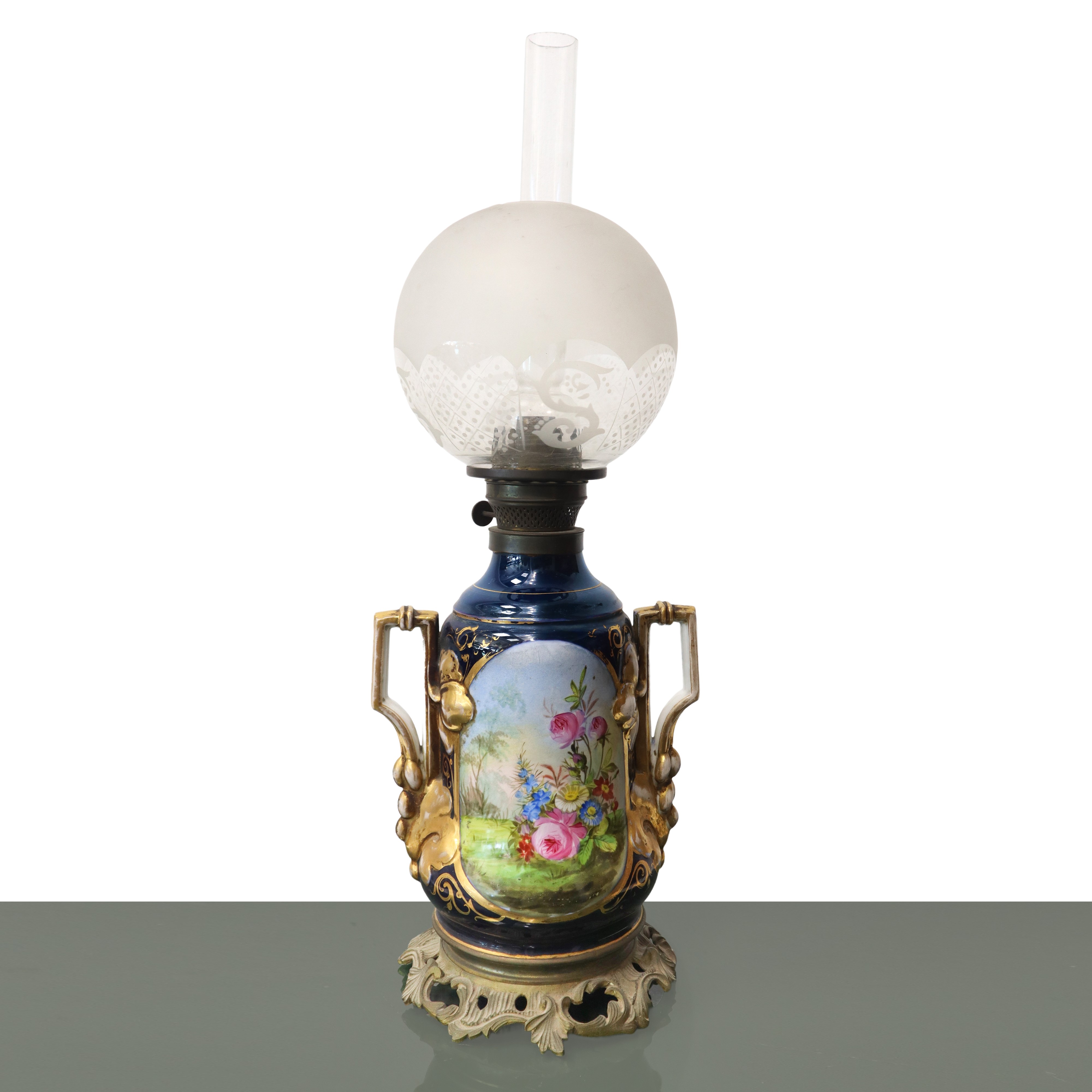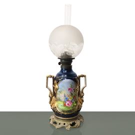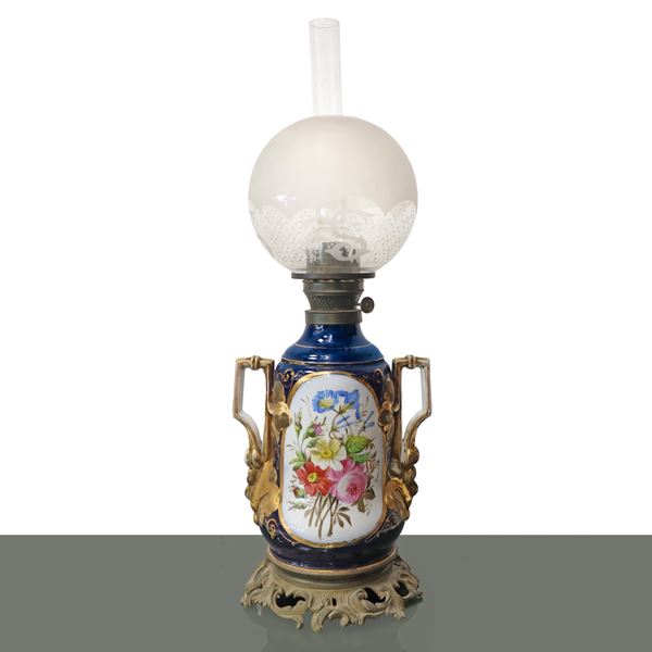 Blue porcelain oil lamp with floral decoration and ball-shaped bowl
