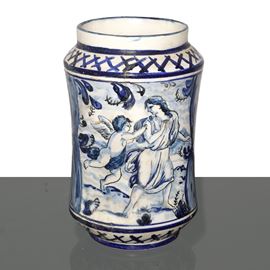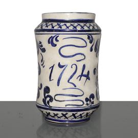 Albarello in Savona majolica painted on the front with a biblical scene "Tobias and the Angel", 1724