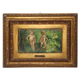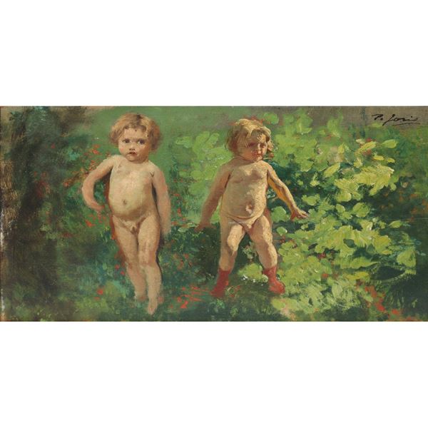 His painting style was always veristic, but rendered with a beautiful, fluid, and luminous touch; this is also evident in our "The Childhood of Adam," where the children's bodies and the surrounding nature are painted with quick, precise brushstrokes.