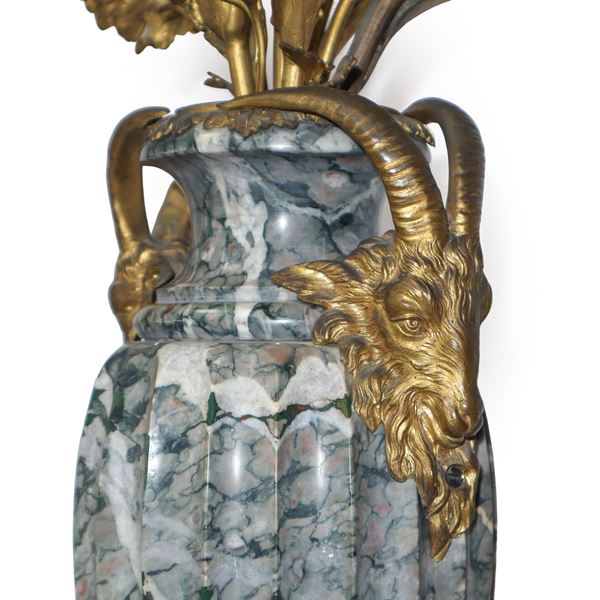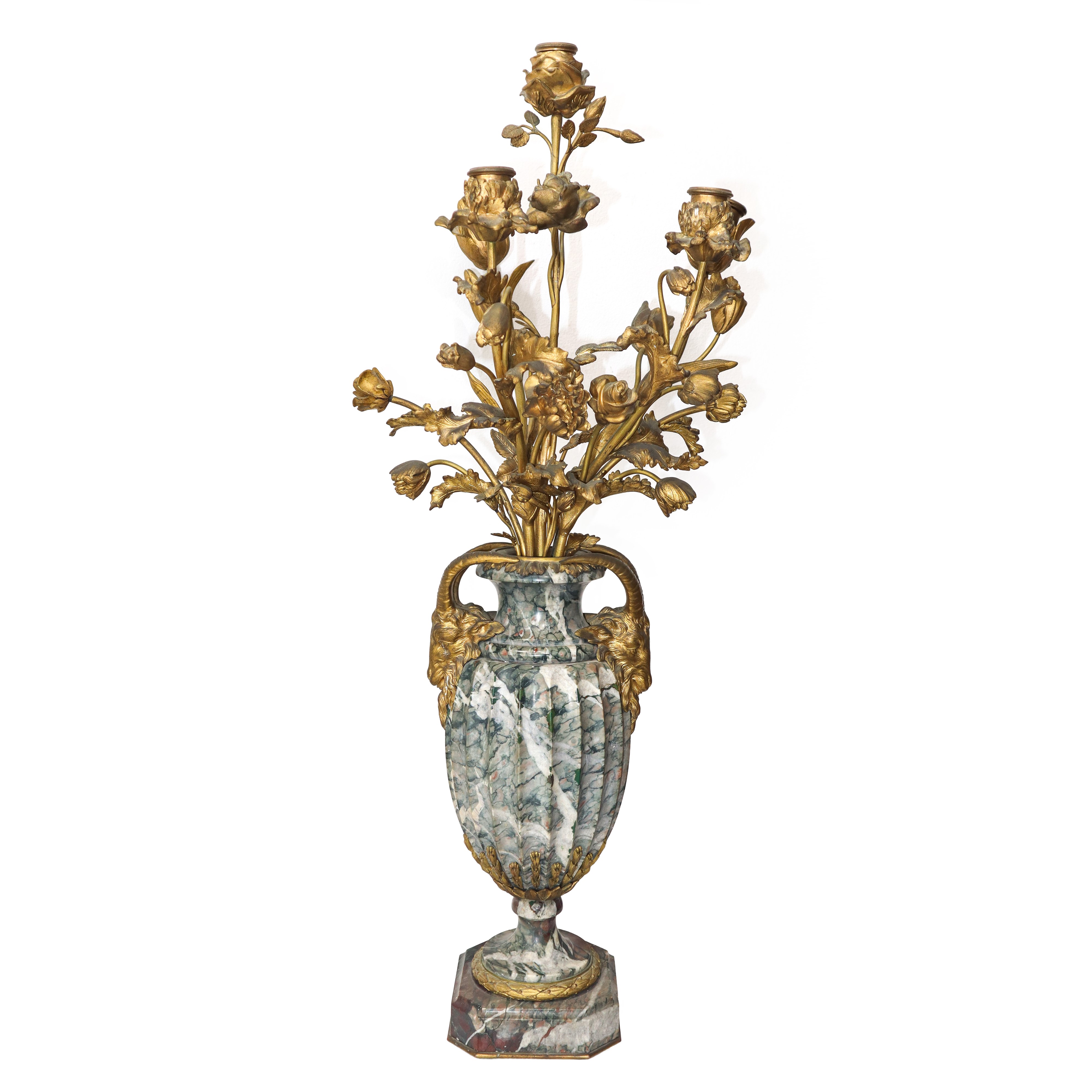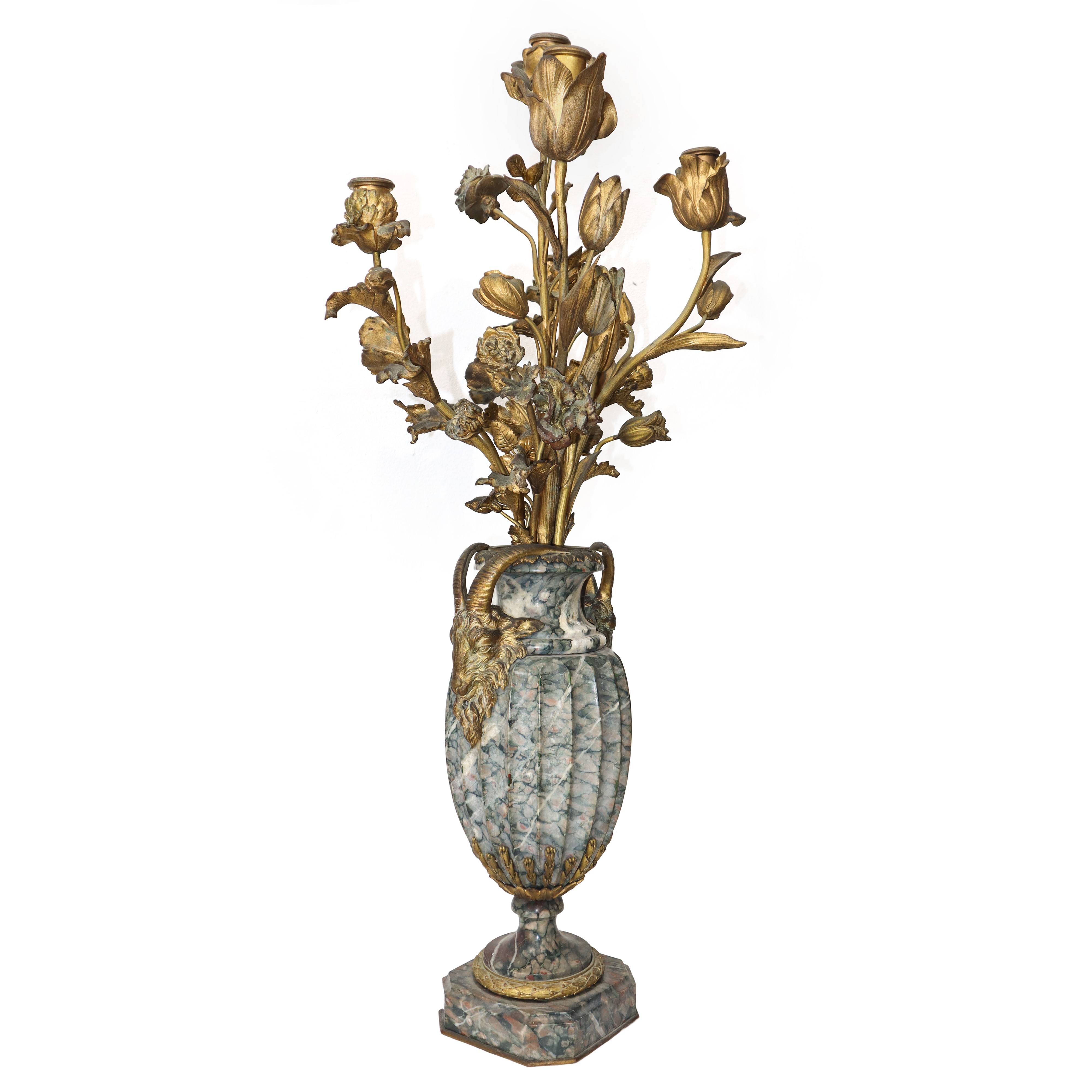 Pair of marble vases with bronzes applied in the shape of flowers and a 5-light candlestick